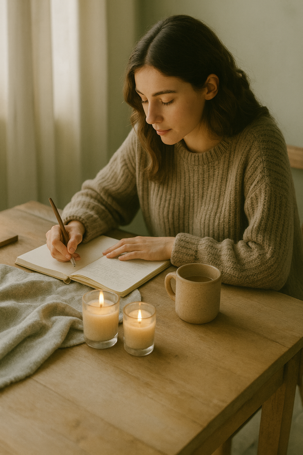 A woman in a beige sweater writing in a notebook at a wooden table with lit candles and a mug.