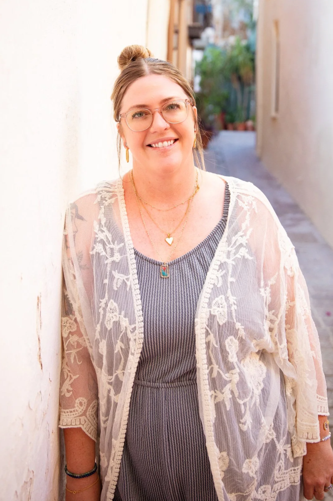 A woman with glasses and light brown hair tied in a bun, smiling, standing in an alleyway wearing a striped dress and a sheer, embroidered white cardigan with layered gold necklaces and bracelets.